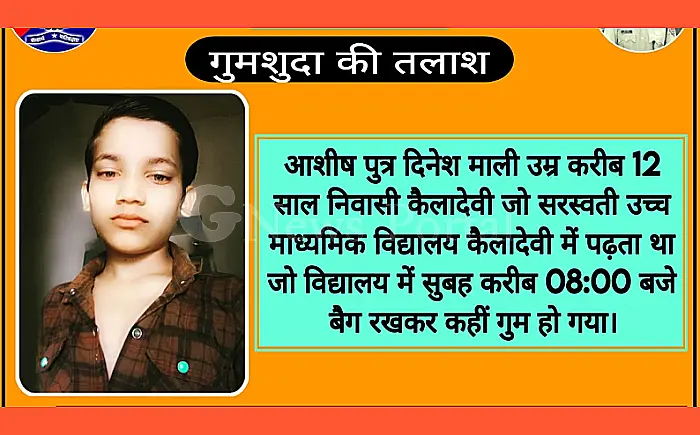 करौली: करौली जिले के कैला देवी में एक 12 वर्षीय छात्र आशीष पुत्र दिनेश माली लापता हो गया है। आशीष सरस्वती उच्च माध्यमिक विद्यालय कैला देवी में पढ़ता था और सुबह करीब 8:00 बजे विद्यालय में अपना बैग रखकर कहीं गुम हो गया।
