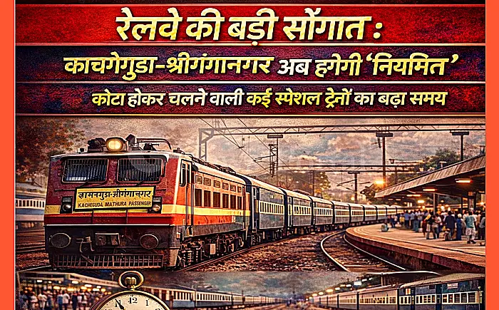 कोटा। यात्रियों की भारी मांग और दक्षिण भारत से राजस्थान की बेहतर कनेक्टिविटी सुनिश्चित करने के लिए रेलवे ने काच्चेगुड़ा-श्रीगंगानगर स्पेशल (07053-54) को नियमित करने के आदेश जारी कर दिए हैं। इसके साथ ही, मुंबई, कानपुर और अजमेर जैसे रूटों पर चलने वाली स्पेशल ट्रेनों के फेरे भी बढ़ा दिए गए हैं।