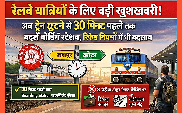 भारतीय रेलवे ने यात्रियों के सफर को अधिक सुविधाजनक और लचीला बनाने के लिए आज से दो बड़े बदलाव लागू कर दिए हैं। पश्चिम मध्य रेलवे (WCR) द्वारा जारी नए आदेशों के अनुसार, अब यात्री ट्रेन रवाना होने के महज आधा घंटा पहले तक अपना बोर्डिंग स्टेशन बदल सकेंगे। इसके साथ ही टिकट कैंसिलेशन और रिफंड के नियमों में भी संशोधन किया गया है।