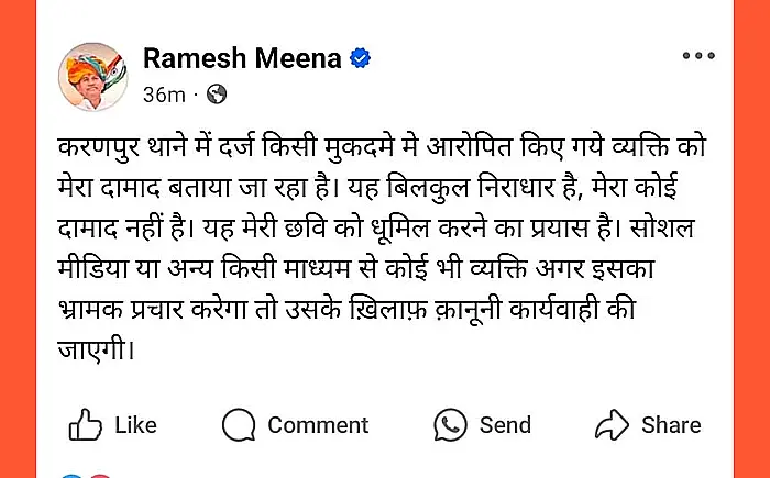 रमेश मीणा ने सोशल मीडिया पर यह भी चेतावनी दी कि जो भी लोग उनके खिलाफ भ्रामक प्रचार कर रहे हैं, उनके खिलाफ कानूनी कार्रवाई की जाएगी। उन्होंने लोगों से अपील की कि वे तथ्यों को सही तरीके से समझें और किसी भी तरह के झूठे आरोपों में ना आएं।