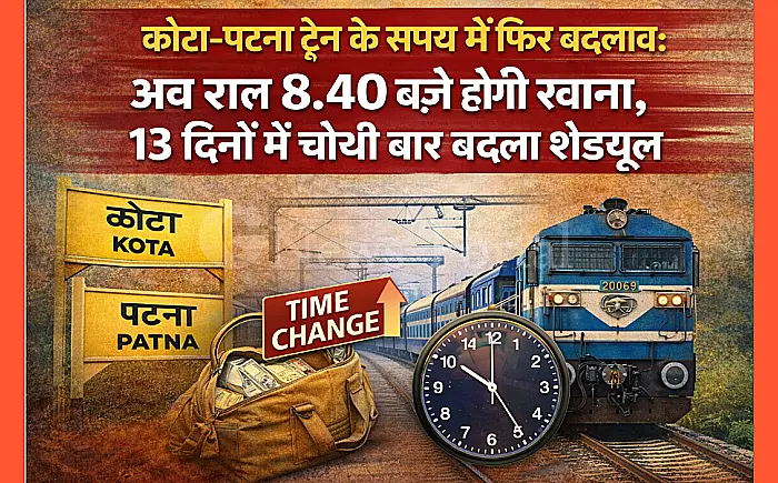 कोटा: कोटा से पटना जाने वाले रेल यात्रियों के लिए महत्वपूर्ण सूचना है। रेलवे ने गाड़ी संख्या 13238-40 (कोटा-पटना एक्सप्रेस) के समय में एक बार फिर परिवर्तन किया है। अब यह ट्रेन अपने निर्धारित समय के बजाय रात 8.40 बजे कोटा स्टेशन से रवाना होगी। यह नई व्यवस्था 6 अप्रैल से 12 मई तक प्रभावी रहेगी।