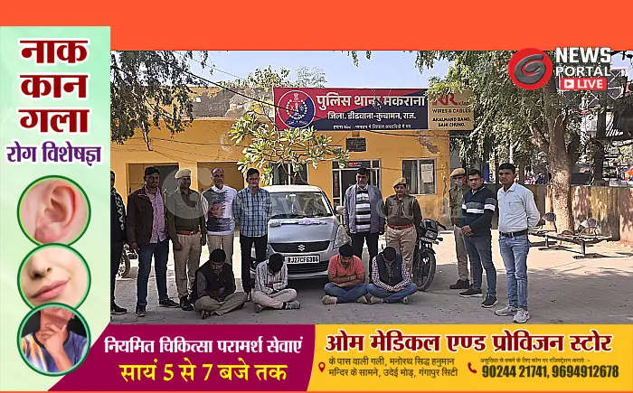 नागौर : मकराना पुलिस ने एक बड़ी कार्रवाई करते हुए अवैध मादक पदार्थों के साथ चार आरोपियों को गिरफ्तार किया है। पुलिस ने आरोपियों के पास से 550 ग्राम अफीम, 500 ग्राम डोडा चूरा और 9000 रुपये नकद बरामद किए हैं। साथ ही, घटना में प्रयुक्त एक स्विफ्ट कार और एक मोटरसाइकिल को भी जब्त किया गया है।