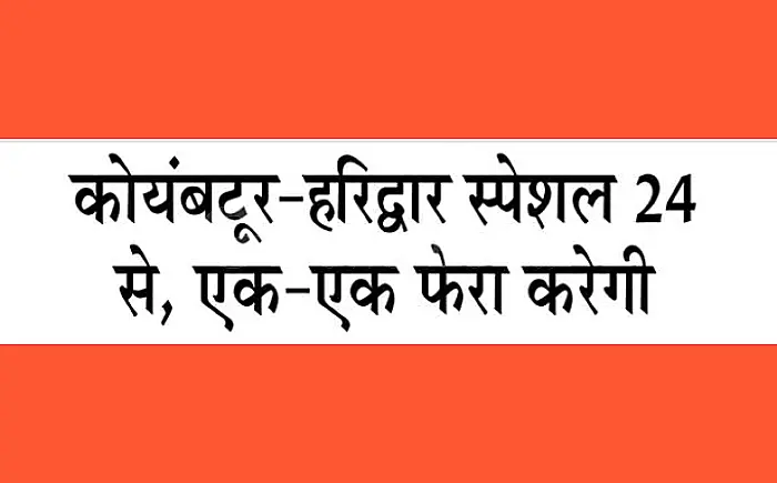 हरिद्वार से कोयंबटूर (06044): वापसी में यह ट्रेन 30 दिसंबर को रात 10:30 बजे हरिद्वार से चलेगी और चौथे दिन सुबह 4:00 बजे कोयंबटूर पहुंचेगी। कोटा में यह ट्रेन सुबह 10:30 बजे पहुंचेगी।