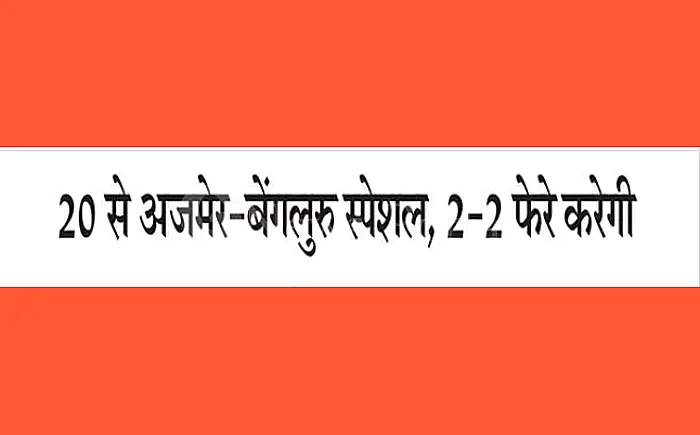 कोटा। यात्रियों की बढ़ती संख्या और सुविधाओं को ध्यान में रखते हुए रेलवे ने अजमेर और बेंगलुरु (येलाहांका) के बीच स्पेशल ट्रेन चलाने का निर्णय लिया है। यह ट्रेन 20 दिसंबर (शनिवार) से संचालित होगी और दोनों दिशाओं से दो-दो फेरे पूरे करेगी।