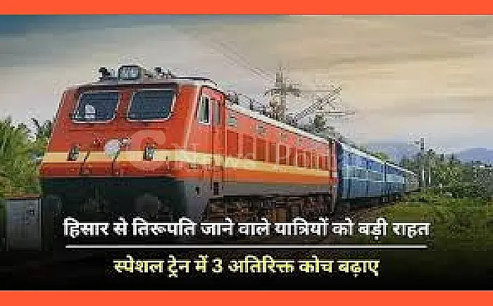 Rail News - हिसार और तिरुपति के बीच चलने वाली साप्ताहिक स्पेशल ट्रेन (गाड़ी संख्या 04717-18) में यात्रियों की सुविधा के लिए तीन अतिरिक्त कोच जोड़े गए हैं। इनमें एक थर्ड एसी और दो स्लीपर कोच शामिल हैं। यह बदलाव 1 फरवरी से प्रभावी होगा।