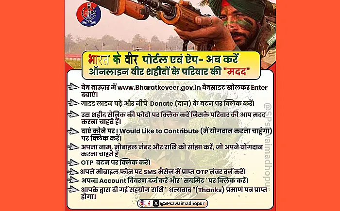 नई दिल्ली: भारत सरकार ने शहीद परिवारों की मदद के लिए एक नई पहल शुरू की है। अब आप "भारत के वीर" पोर्टल और ऐप के माध्यम से ऑनलाइन शहीद परिवारों को दान कर सकते हैं।
