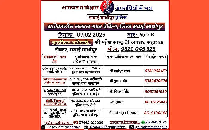 हैशटैग: #सवाईमाधोपुरपुलिस #रातगश्त #पुलिसकार्रवाई #राजस्थानपुलिस #सुरक्षा #अपराधनियंत्रण #समाचार #गश्तअभियान #महेशसान्दू #टीनूसोगरवाल
